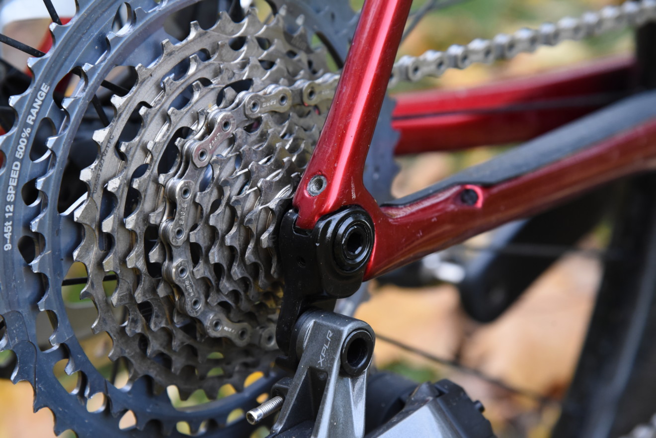 Převodník eThirteen držel řetěz i na kamenech a kořenech a zcela přesvědčivě. Díky kombinaci jeho 40 zubů s dvanáctirychlostní kazetou (opět eThirteen) s neobvyklými krajními pastorky s 9 a 45 zuby jsem netrpěl nedostatkem převodů. Spodních deset pastorků je vcelku plynule odstupňováno, největší dva mají větší odskok – a největší je jednoznačně pouze vyprošťovák pro ta nejtěžší, spíše už biková stoupání.