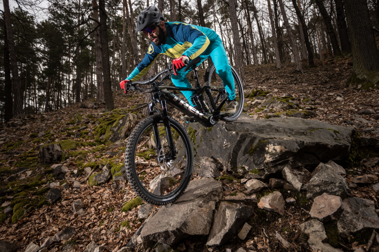 Jakmile mi hlava tohle všechno přelouská, začnu si jízdu konečně užívat, a to plnými doušky. Výkonu je dostatek, motor jemně vrní a já letím lesem. Kořeny, kameny, sjezdy, výjezdy, hlava nehlava. Pláště dobře drží i na jarní podmáčené půdě. Hrubší Bontrager SE6 vepředu vede stopu a jemnější SE5 vzadu tlačí kolo vpřed. Tloušťka 2,5“ opticky i jízdně sedí. Jen občas při silnějším záběru cítím, jak mi zadní kolo rve hlínu pod zadkem.