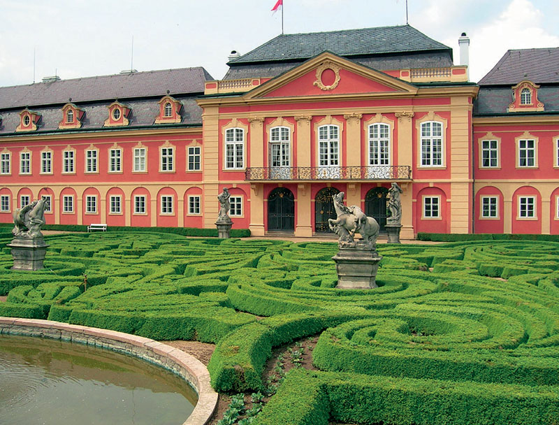 Bonjour jardin de paradis. Otevírá se nám brána rocaille, tedy rokoka nebo raději řečeno pozdního baroka. A to brána vskutku velkolepá, podobou trojkřídlé stavby zámku Dobříš. Prostory nádvoří dýchají mocí dějin, úprava a stylizace je fantastická. Přestavba z let 1745–1765 se Jindřichu Pavlu Mansfeldovi povedla uskutečnit – nebojíme se tvrdit – k architektonické dokonalosti. Jižní strana zámku nás překvapuje velmi osobitou, ornamenty zdobenou symetrickou francouzskou zahradou. Procházet se zde je příjemnou relaxací, a až se právě rekonstruované sousoší Napájení Heliových koní stane plně funkční fontánou s proudící vodou, dojem bude doopravdy působivý.