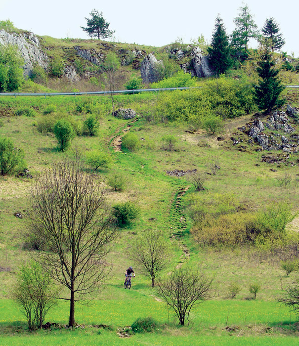 Kořenitý úsek končí na lesní příjemné cestě, vedoucí do Ostrova u Macochy. Zato sjezd přes louku, kde se stezka ztrácí ve vysoké trávě, musíme místy absolvovat i pěšky. Dole nás čeká cyklotrasa a snad až moc pohodlná cesta do Jedovnice. Pokračujeme po cyklotrase, která obkrouží rybník Olšovec, léta to středisko místního maratonu, a zmizí v lese. Poměrně rychle se dá jet až do Bukovinky. Tam se od cyklotrasy odpojíme a sjedeme doprava na červenou značku a o kousek dál se pak škrábeme mlázím na silnici a pokračujeme zpevněnou cestou pořád mírně nahoru.