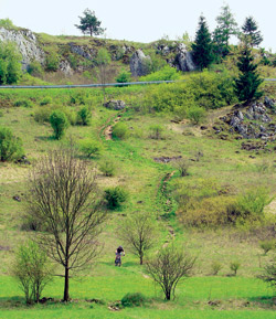 V lese se naštěstí sklon přece jen srovná a chvílemi si užijeme i pohodlnější jízdu, pěšiny střídá i zpevněná cesta. Na kopci změníme barvu značky na modrou. Ta nás dovede k silnici, kterou překonáme a přes louku posetou stovkami modrých kvítků opět míříme k lesu. Následující stoupání je spíš vhodné pro kamzíky než pro cyklisty. Kolem běžící divoké prase chvíli hrozí popohnáním naší skupiny. Naše snaha je však odměněna, krátký sjezdík nás vypustí na křižovatku turistických značek u další silnice. Nezdržujeme se a přehoupneme se přes vozovku, dolů ze sedel, podlézt svodidla a hurá za modrou značkou mizící mezi stromy – sjezd dolů do Josefovského údolí je úžasný a hravý. Škoda jen, že není delší.