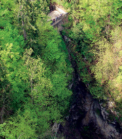 To už jsme blízko dnešnímu cíli. Stačí projet vesnicí a neznalému se otevře nečekaný pohled do skalnatého údolí, zcela nepodobného dosavadní okolní krajině. Silnice se kroutí do údolí, zařezaná do skalnatého úbočí. Červená značka ještě mnohem krkolomněji míří tamtéž za svodidly mezi kameny – další možnost vyzkoušet si techniku jízdy. Zato hned vzápětí je vše jinak – šplháme v sedlech biků serpentinami silničky mířící k Macoše. Tedy přesně k jejímu ústí. Nahoře u propasti stojí restaurace a stánky, a pak také Horní můstek, z něhož je až mrazivý výhled dolů do strmé hlubiny. Nejeden člověk zde již skončil svoji životní pouť. To ale nejsou myšlenky pro nás. Výhled je také na Dolní můstek umístěný kus nade dnem propasti a na okolní skalní stěny. K cestě sem nahoru lze použít i lanovku od vchodu do Punkevních jeskyní skrytých pod námi (lze přepravit i kolo). Po dostatečném pokochání se pustíme kousek zpět po silnici a odbočíme do lesa po zelené značce. Až křik zezadu mne a Pavla upozorní, že přejíždíme řadu kořenů – Jirka na rozdíl od nás sedlá pevný stroj.