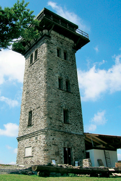 Během dalšího stoupání oceňuji stále více konstrukci svého biku. Můj stroj je díky větší osové vzdálenosti nábojů stabilnější, a proto houževnatěji zvládá výstup. Přesto zanedlouho sesedáme a začínáme kola tlačit. Neradi vzdáváme boj, ale shledáváme, že pokračovat dál prostě už nelze. Kdo by si na to troufl? Po boku věrných hliníkových biků zdoláváme posledních pár desítek metrů. Na vrcholu objevujeme rozhlednu silně připomínající šumavský Poledník. Ani její menší výška (30 metrů) jí však neubírá na atraktivitě, Čerchov má své vlastní kouzlo. Na vrcholu však čeká na znaveného bikera ještě jedno překvapení – Kurzova věž z roku 1905, 24 m vysoká, vyzařující do kraje úplně jiným architektonickým stylem. Z jejího ochozu je při dobré viditelnosti možno zahlédnout i Alpy (skupinu Dachsteinu vzdálenou 230 km vzdušnou čarou).