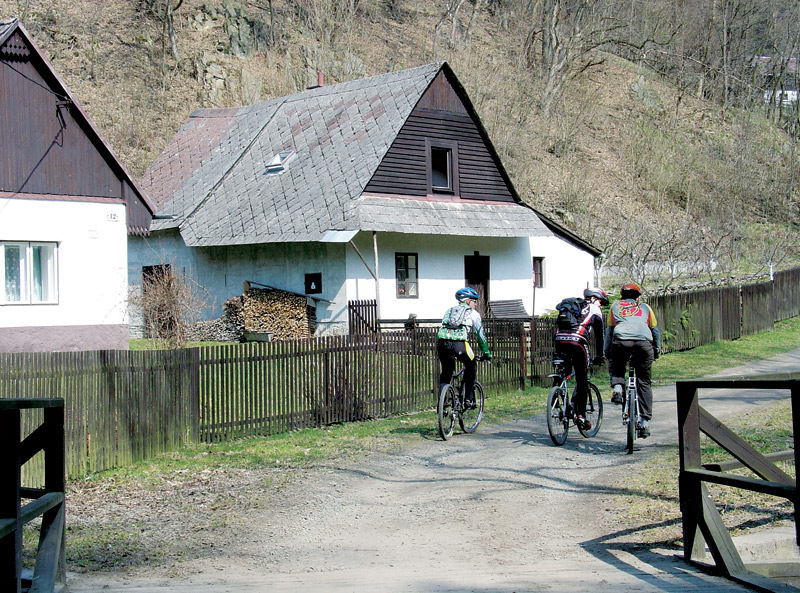 Pod zámkem se dělí turistické trasy, my míříme dál po modré. Následuje další brod, nešťastně upravený, ale nakonec do něj vjedeme, ač jen o pár metrů dál je lávka. Stojí mne to kuriozní defekt: narážím ve vodě do kamenu a když se snažím rychle dostat z vody, ukopnu ventilek od bezdušovky. Po rychlé opravě pokračujeme do prudkého kopce, kde opět přijde ke slovu tlačení. Pak už ale pohodlně uháníme mírnějším kopcem a krásným sjezdem do Kladek. Obcí sjedeme na stejnou křižovatku, kde jsme ráno odbočili k Bouzovu, nyní se dáme zase zelenou, ale opačným směrem do kopce nad vesnicí. Dostaneme se do lesa a pak mezi pole. Pokud pojedete v našich stopách, pozor na odbočku doprava k prudkému sjezdu do vesnice Dzbel, není značená! Točil se tu „Tmavomodrý svět“. Stavíme v místní hospůdce, ke které dorazíme po odbočení ze zelené značky po silnici. Nad klasickým cyklistickým nápojem probíráme dnešní trasu, k dobré náladě přispívá praskající oheň v krbu – přece jen je brzké jaro.