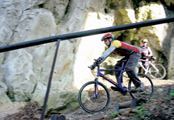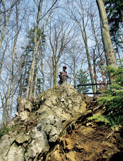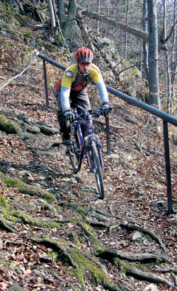 U schodů stojí chata s restaurací a hotelem Jeskyňka, od něhož se dáme po modré, opustíme zpevněnou cestu a po úzké pěšině se řítíme technickým sjezdem mezi stromy. Vychutnávám nový full, za zády se mi řítí Červeňák, slunce vytváří mezi větvemi stromů sloupy světla. Absolutně nic nám nechybí. Jednomužná stezka sice pokračuje dál, ovšem brutálním sjezdem po kořenech a kamení podél kovového zábradlí. Je to vstupní brána do kouzelného Zkamenělého Zámku, skalního útvaru vytvořeného zřejmě potokem Špraněk. Kdysi zde stál hrádek, zaniklý asi kolem roku 1300 s výstavbou Bouzova. Na prudkém svahu si chvíli cvičíme zručnost v ovládání kola a pak už scházíme, sjíždíme i padáme do údolí.