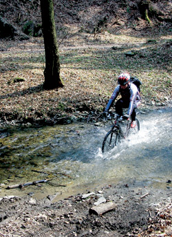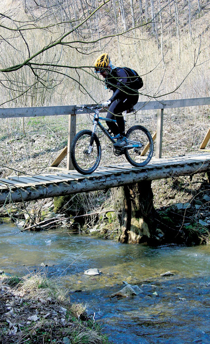 Prudký sjezd po žluté značce nás dostane zpět do údolí k brodu přes potok Javořička. David se ho vydává přejet a uprostřed efektně pokládá sebe i kolo do pěnící vody. S nečekanou mrštností se vzápětí dere obřími skoky z vody na břeh. Není divu, že se za ním nikomu nechce a potupně potok překonáváme po nedaleké lávce. David na nás čeká a vylévá přebytečnou vodu z různých zákoutí oblečení.