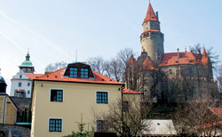 Zelená nás pak přes kopec dovede do Kozova, kde láká v poklidném stínu zahrádka před restaurací. Už jsme zde seděli mnohokráte, ale tentokrát pokračujeme dál po zelené značce. Je to jak na houpačce, nahoru, dolů, nahoru… Poslední nahoru je opravdu hodně prudké a skoro řadíme kašpárky. Konečně se totiž dostáváme k dominantě širokého okolí – hradu Bouzov. Vypíná se vysoko na kopci nad údolím někdy od roku 1300 a jeho siluetu zná snad každé dítě nejen v naší republice – jeho romantické exteriéry posloužily třeba v Arabele a ve spoustě dalších pohádek. Hrad určitě stojí za prohlídku, ale my jej už viděli – naposledy loni, když se zde náš dnešní spolujezdec Červeňák ženil, což mu škodolibě připomínáme. Raději se občerstvujeme u jednoho stánku.