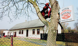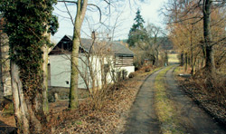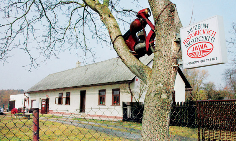 Po chvilce domluvy, zda-li bude hospůdka a občerstvení již zde, pokračujeme bez zastávky směrem na Ledce. Stále po červené směřujeme po lesní cestě přímo do srdce Přírodního parku Jabkenicko. Počasí se kazí a začíná pršet. Cesta je přímá jak výstřel z pušky, je však také plná děr a výmolů. Části široké cesty ale zůstávají zatím téměř suché, a tak jedeme vcelku komfortně. Uprostřed lesa opouštíme červenou značku a pokračujeme dále po zelené. Je to pořád po „lautr rovině“, a tak kilometry přibývají rychle. Protahujeme se vesničkou Ledce a vzhledem k tomu, že už zcela nepokrytě lije, padá rozhodnutí vynechat jeden z cílů výletu – zámek Dětenice. Zkracujeme tedy cestu po silnici přes Rabakov do Domousic, kde chceme opět najet do terénu. Zámek jsme sice vynechali, ale objevili jsme jinou nádheru. Před Rabakovem vidíme motorku vznášející se ve vzduchu, která slouží jako poutač soukromému muzeu motorek Jawa pana Františka Miclíka. A protože nás staré stroje zajímají, hrneme se dovnitř. A stojí to za to. Je tu množství zajímavých kousků včetně bonbónků, jako jsou závodní plochodrážní speciály a v rohu cení ocelové hroty i pneumatiky závoďáku na ledovou plochou dráhu. Jde z nich docela hrůza. A tomu všemu vévodí předválečné monstrum Čechia-Böhmerland. Motorka pro tři jezdce, která je tak dlouhá, že snad musí do zatáček přešlapovat.