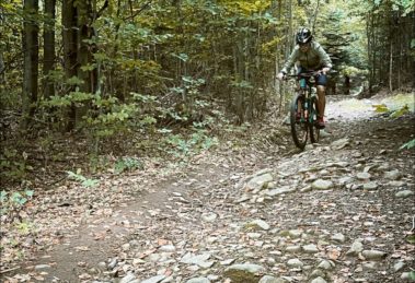 Žlutá se drží asfaltu, jen v jednom místě jej opustí krkolomnou zkratkou po lesní pěšině. Doporučuji ale zůstat na cestě, protože krátký únik nestojí za to – o kus dál stejně budete pokračovat po asfaltu. Kopec sice vypadá, že nebude mít konce, ale přece jen se vydrápeme nahoru a kola najednou sviští čím dál rychleji. Ale pozor, žlutá odbočí mezi stromy a hravou stezkou poskakuje mezi mlázím přes kořeny i balvany a vymletými stružkami dále z kopce. Od kol odletuje zvířený prach, počasí letos přeje a teplo je neskutečné i zde v horách.
