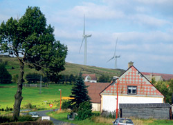 Před námi je dlouhý sjezd do Nové Vsi, jíž dominují obrovské lopatky větrných elektráren, pod nimiž se jako krabičky od sirek krčí malé domy – výjev takřka jak z epizody seriálu Star Trek. Jedná se ale o ekologickou energii, kouřící komíny by měly na životní prostředí jistě daleko horší dopad. V tomto případě jde jen o zvyk pohledu na jiný ráz krajiny. Dále pokračujeme po silnici až k hraničnímu přechodu Mníšek, kde se opět noříme do lůna přírody, na místní naučnou stezku a červenou značku.