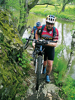 Odtud se lesní cesta a poté pěšina s výhledem na Mohelskou hadcovou step rozkládající se na protějším kopci prudce sklání směrem do údolí a my přejíždíme druhé vodní dílo – Mohelno. Zde pokračujeme slibně vyhlížejícím úsekem, který se za zatáčkou mění v těžko prostupnou soutěsku doplněnou velkými a ostrými kameny. Naštěstí se jedná o úsek dlouhý asi jen 500 m, po němž následuje opět kousek příjemné cesty. Další část po značce raději neriskujeme, protože ani podle mapy nevypadá příliš vábně. Raději volíme silniční přesun na Dukovany směrem na Jamolice a před nimi uhýbáme vlevo po žluté TZ opět do terénu. Míjíme zříceninu hradu Templštejn, který zanikl po požáru v polovině 15. století. Zde se opět napojujeme na červenou TZ a po sjezdu do údolí pokračujeme podél vody až do Ivančic.