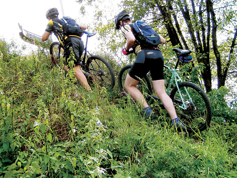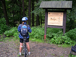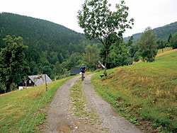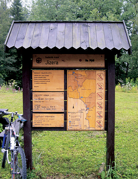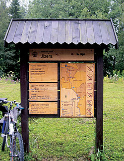 Další úsek se snažíme nalézt tak, aby bylo možno se dalo jet mimo silnici. Bohužel nás takový poměrně dlouhý úsek nemine. Jediným kladem alespoň zůstává, že silnice celkem přesně sleduje tok Jizery. Slabá útěcha. Asi po dvou hodinách asfaltové mánie dorážíme do Semil. První hodnocení: počáteční okouzlení Jizerou pomalu opadlo. Monotónní šlapání po asfaltu je ubíjející, i když silnice to byla pěkná a bez většího provozu. Ze Semil jedeme znovu znovu do terénu, a to po červené značce. Jen pozor – dalo by se zde pokračovat po tzv. Riegrově cestě, ale sem je vjezd cyklistům zakázán. Zvolili jsme proto objezd a na červenou se vrátili až o kousek dál. Dále není mapa nezbytná, stačí se držet červené značky až do Malé Skály. Vychutnáváme příjemnou cestu po asfaltu (je to jen krátký úsek, takže tato vložka nevadí) do Železného Brodu. Odtud asi čtyři kilometry po kamenité cestě na břehu (cca dva metry od řeky) než Jizeru na chvíli opustíme výletem do lesa směr Lišný nedaleko centra Malé Skály.