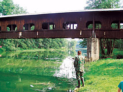 V Kynšperku objevujeme skvělou dřevěnou krytou lávku, jako vystřiženou ze švýcarských Alp. Za ní opět kousek „singlíku“, pár turistů, první vodáci a první stánek s točeným pivem – zavřený. Minimálně jeden bidon na suchu, peče už to celkem pěkně, ale jede se dál. Sekáčovi trávy uctivě děkujeme za směr, který nám odmával kosou. Po levém břehu se zase prodíráme houštím. Pod Drsným vrchem lepíme duši. Za ďábelského chechotu škodolibého rybáře: „Ta-dy? A-ces-ta? Cha-cha-cha,“ se vracíme do Kynšperku přes most na protější břeh Ohře. Po sekáčovi se slehla zem. Byl tu vůbec? Poučení druhé: Mrknout do mapky je menší zlo, než spoléhat na sekáče!