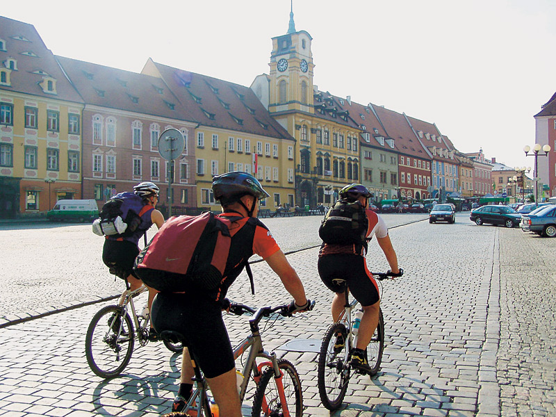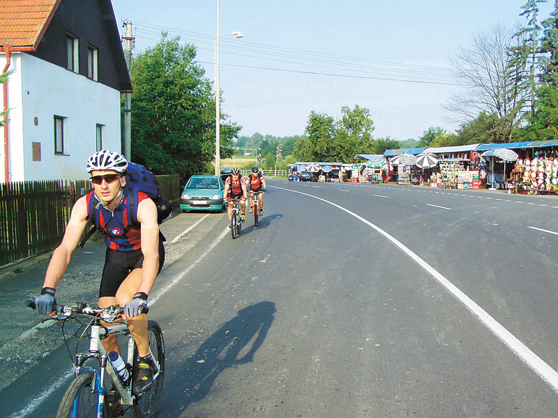 Pak je to tu na chvíli zas. Lesní cestičku kříží stará silnice z Chebu na Pomezí. Pár domků bez čísla popisného, jimž z okapů visí vyšisované srdce. Trefujeme pěšinu a konečně opět cítíme vodu. Turistická zelená na západním okraji Chebu nabírá směr na Františkovy Lázně a konečně je tady první „singlík“. Krásná houpavá udusaná pěšina bez kamenů, esíčka, klopené zatáčky… paráda! Asi kilometrová satisfakce za všechny anonymní holky z hampejzů. Vjíždíme na náměstí do Chebu, kde Vietnamci stloukají kovové konstrukce stánků.