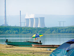 Druhý den ráno nasedáme a po včerejší červené vlně se v těsném sousedství vody ploužíme vpřed. Občas si to zkrátíme, když se ve snaze nevzdalovat se vodě vyhneme turistickému výpadu k nějaké významné pamětihodnosti v okolí. Stráž nad Ohří, Korunní kyselka, Perštejn. Co chvíli nás vyleká sborové „ahóóój“ z vody. Před Kláštercem nad Ohří se krajina zklidňuje a rozpíná. Za Kadaní už nám elektrárna u přehrady Nechranice ukazuje vztyčený prostředníček. Objíždíme vodu podél břehu a těšíme se na pivko na rozloučenou.