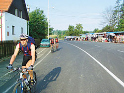 Karlovy Vary jsou oříšek, jenž se snažíme rozlousknout objížďkou přes Kozí hory, Čertův kámen a Vyhlídku Karla IV. Docela se nám to daří. V davu dam srkajících porcelánové konývky se ujišťujeme, že už jsme měli být pryč, a po silnici mizíme. Za Radošovem naskakujeme na červenou, z níž prakticky slezeme až druhý den odpoledne v Kadani. Dobře značená turistická stezka je lahůdkou pro bikery. Skoro pořád těsně podél vody s poměrně hustým špagátem hospod. Vracíme se minimálně, aniž bychom sahali po mapě. Těžké kopce kontra sjezdy se zadky na zadní gumě. Louky s lučním kvítím versus hory doly černý les. Sem tam pramen, zřídka zřídlo. Od úpatí Vojenského újezdu Hradiště, přes Kyselku, Šemnici, do Velichova je to lahůdka pro každého bikera, který ale nemá, tak jako my, v nohách sto kilometrů. Ve Velichově dneska končíme.