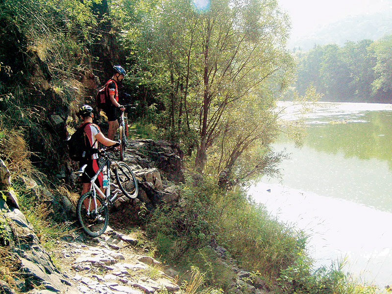 Trefujeme zelenou podél řeky a po kamenité lesní cestě projíždíme přes Těšovice do Starého sedla. Lanová lávka a… hurá, sláva, je to tady! Technická cesta přímo nad řekou. Vlhký vzduch, měkký podmáčený terén, ale prakticky bez bláta, adrenalinové i trialové pasáže, sem tam nějaký ten polom. Ale jinak paráda. „I ty, Sokolove. Co jsme si, to jsme si, vše je zapomenuto.“ Obzvlášť, když na rybářské pěšině těsně u vody uprostřed lesa narazíme na bagr. „Z prostředků Královského poříčí a za přispění města Sokolov a Loket budujeme podél Ohře cyklistickou stezku. Hotova by měla být ještě do konce letošního roku,“ šokuje později starosta Lokte s příznačným jménem Jiří Kola(řík). To sice netušíme, když vjíždíme do města Loket, přesto jsme ze zeleného úseku cesty v euforii. Řeka mnoha tváří dostává svůj rozměr. Kontrast šedi a zeleně bije do očí a trhá plíce. Bušíme do pedálů v očekávání věcí příštích.