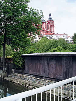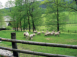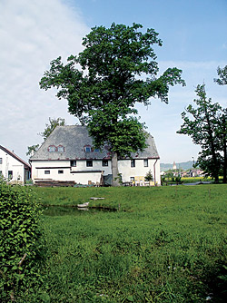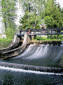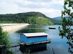 Vodní nádrž objíždíme po žluté značce, která vede převážně v lese nebo po asfaltu. Přímo v cestě nám stojí brána, která je součástí oplocení rozsáhlého pozemku u statku. Co teď? Možnost rozumně jej objet není. Najednou slyšíme: „Pojeďte, pojeďte.“ Přijíždíme k opálenému padesátníkovi. Je z Mnichova, před třiceti lety emigroval a po revoluci si koupil tenhle statek, který si sám renovuje. Rozhodně mi nepřišlo, že patří mezi škodiče, kteří vykřikují: to je můj pozemek a nikdo přes něj nepůjde! Spíše mu vadí přístup lidí. Nikdo se ho neptal, jestli přes jeho pozemek těsně kolem vchodu do stavení může vést turistická značka. A taky vandalizmus některých lidí (místních i turistů). Říká, že vybuduje pěšinu kolem oplocení. Celkem sympatický chlapík se zrovna chystal z ohromného kmene vytesat koryto k pramenu v alpském stylu. Popřál nám šťastnou cestu.