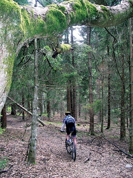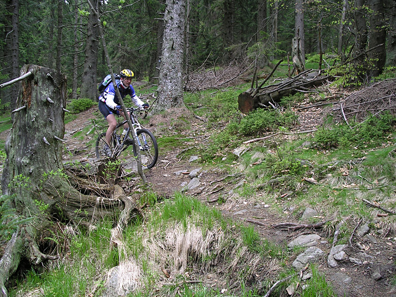 Vrchol Pancíře (1214 m n. m.) nesmí zůstat nepokořen. Ještě chvíli se držíme po šotolině a pak prudce stáčíme doprava na vrchol. Velmi technické a strmé stoupání po kořenech a kamenech nás vede přímo k rozhledně, která je na Pancíři a rozhodně stojí za to si ji vyšlápnout, výhledy na Šumavu máte jak na dlani. Za dobré viditelnosti jsou vidět i Alpy, my však máme trochu smůlu, je mírný opar. Za chvíli klesáme po stejné cestě, po jaké jsme jeli nahoru, a pak pár metrů po žluté a zase na modrou značku. Hned na začátek je to úžasný zážitek. Náročný trejlík vede po kořenech, kamenech a klikatí se lesem mezi spadlými stromy, které jdou většinou obkroužit. Taky jedeme chvíli potokem, možná je to jeden z pramínků Úhlavy. Každou chvíli musíme zastavit, abychom mohli shlédnout krásnou šumavskou přírodou.