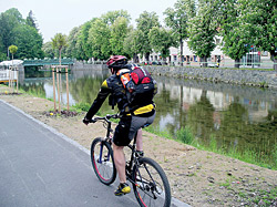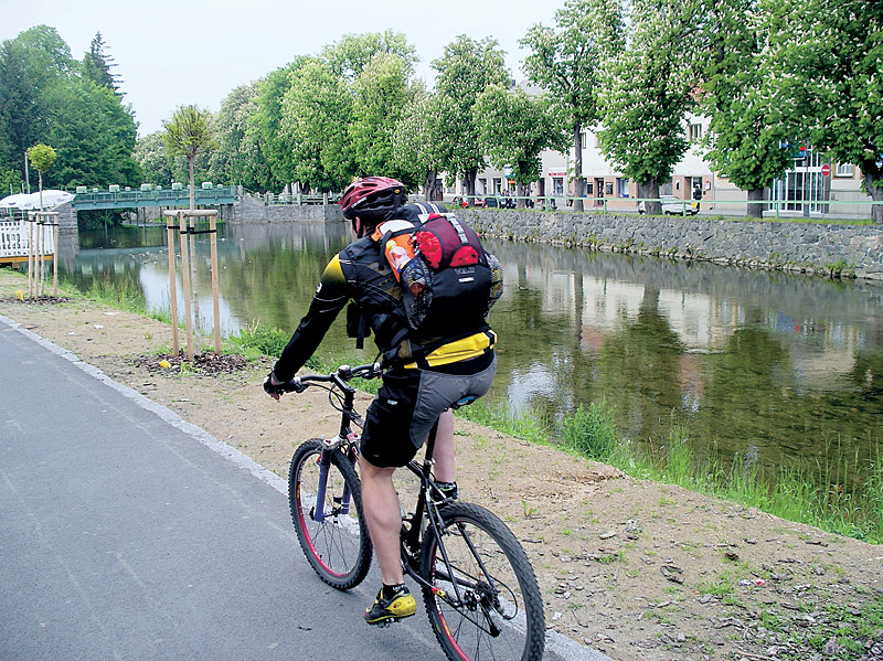 Část trasy, která následuje, není nakonec tak úchvatná. Je to lesní asfaltka, po které stoupáme a klesáme od Kaliště do Příchovic. Asi v půli cesty zastavujeme u mohyl, skalních útvarů, které byly za středověku obydleny. Příchovice mají barokní zámek, Přeštice barokní kostel. Nezbytné foto a jedeme dál. Červená značka se dál houpe nahoru dolů, někdy dál od řeky, někdy blíž. Občas ji křižuje a takhle celkem příjemně cesta pokračuje až do Plzně, kde trochu kličkujeme na okraji města. Už jsme skoro v centru a já mám pořád pocit, že město ještě nezačalo. Jedeme podél řeky Radbuzy, asfaltovou pěšinou kolem spousty zeleně. Mnoho Plzeňáků sem chodí na procházky, proto jedeme opatrně a pomalu. Za železničním mostem se dáme doprava, popojedeme asi 700 metrů a jsme na hlavním nádraží. Odtud se dá vlakem dopravit skoro všude.