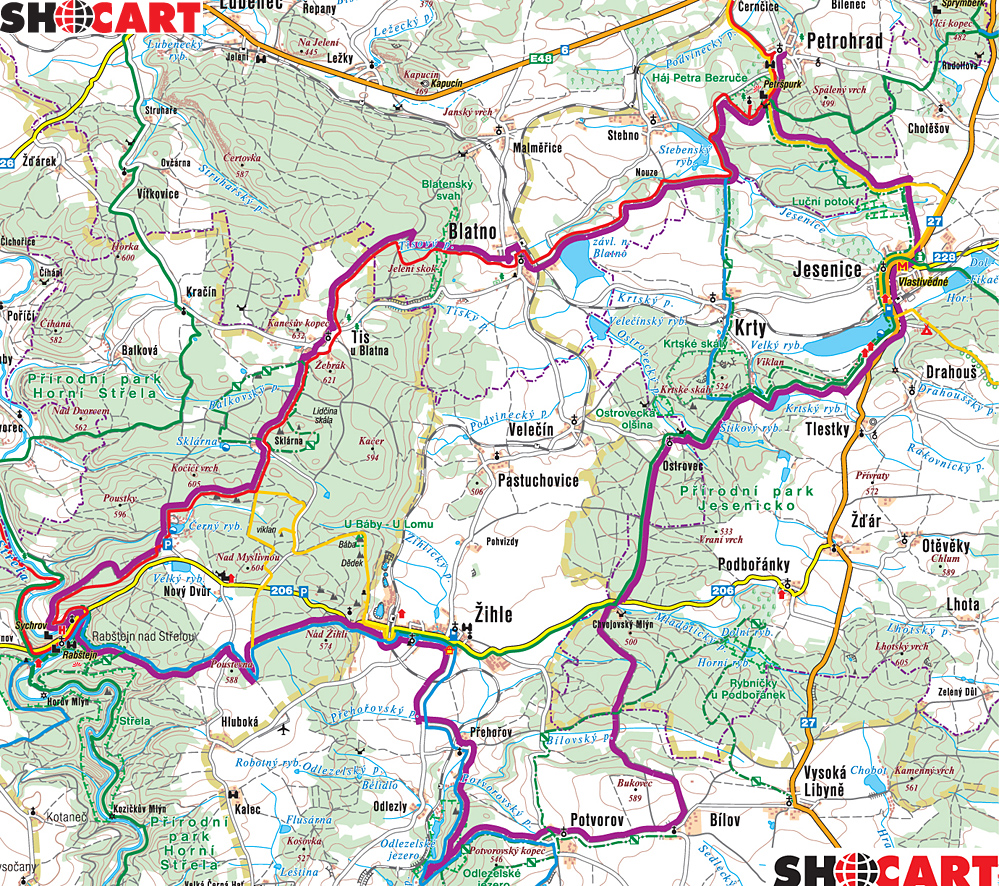 Tis je název osady, ve které se následně ocitáme. Hostinec zde samozřejmě nechybí, a tak máme možnost občerstvení, po němž nás přivítají rozlehlé louky. Přes ně se opět dostaneme k lesu, jež nám nabídne pár zatáček a dolíků než, přijde další lahůdka: asi sto metrů dlouhý sjezd korytem potoka. Sedlovka zasunutá na doraz je samozřejmostí, i tak se však poslední sekce sjet nedá. Pokud se vám to povede, tak smekám. Jako další nás přivítá ves Blatno, ve které rovněž nechybí restaurace a také rybník. Odtud pokračujeme stále po červené až k rybníku Stebenskému a dále výjezdem až na zříceninu hradu Petrohrad. Tu se již opět setkáváme se značením Surovce. Na hradě Petrohradě dáváme nevratně sbohem červené barvě a až do Jesenice bude náš zrak pátrat na stromech po barvě lídra Tour de France. Značka nás pohoupe bukovým lesem, nechá nás přivonět k lučnímu kvítí a již nadobro nás dovede zpět do Jesenice.