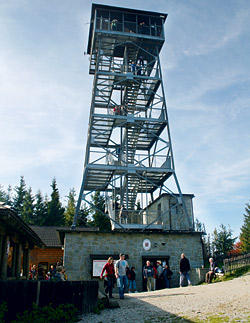 Nejdřív ale pohodlně dojedeme k rozhledně na Čantoryji, je vzdálená od chaty jen asi půl kilometru. Poměrně moderní stavbu navštívíme, je příjemné počasí, svítí slunce a jeden z posledních letošních teplých dní využívají spousty turistů nejen z naší vlasti, ale i Polska, protože po hřebenu běží hranice mezi našimi státy a navíc z obou stran sem vedou značené cesty. Po duševním občerstvení pohledem z rozhledny, mimochodem pokaženým i množstvím domů, nových chat a hotelů rozlézajících se na polské straně do svahů hor jako jakási nákaza, odjíždíme.