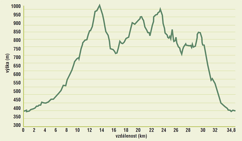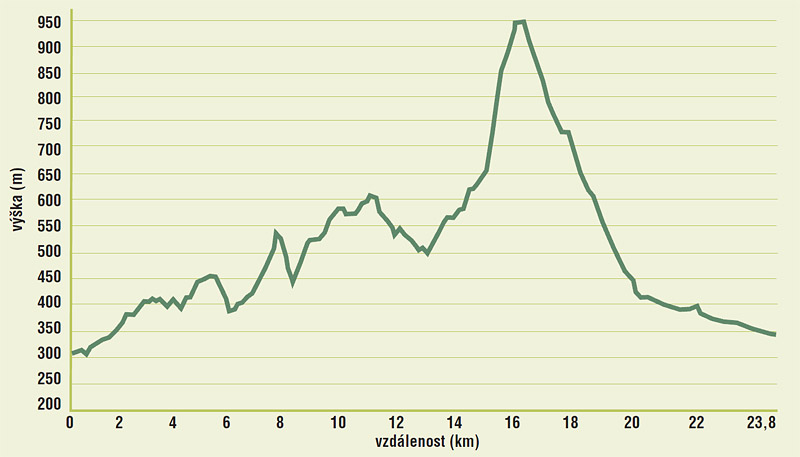 Podle mapy vede po hranicích modrá značka na naší straně a červená na polské, ve skutečnosti se ale většinou orientujeme spíš podle hraničních kamenů a využíváme stezek na obou jejich stranách: někde je lépe znatelné naše, jinde polské značení. V každém případě ale cesta nevede snad ani minutu po rovině: buď se řítíme složitým sjezdem, nebo rveme kola vší silou vzhůru, mnohdy ovšem v ne zcela cyklistické pozici – tedy spíš kola tlačíme, než na nich jedeme.