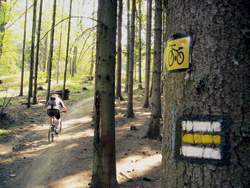 Cesta se stočí kolem Tanečnice (k jejímu vrcholu vede odbočka spíše pro pěší). Dál netřeba většího popisu, je to pořád to stejné, sjezdíky a výjezdy splývají do jednoho, ale rozhodně nenudí. Jen teskně lituji, že dosud nedorazilo mé nové kolo – tady bych jeho odpružení prověřil dokonale.