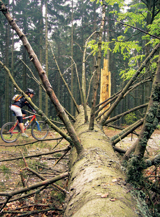 Podél hranice vede červená značka, pro změnu opět do kopce. Stoupáme úzkou pěšinou, vyjedeme na chvíli ze skrytu lesa a dál už začíná zábavnější část, míjíme rozhlednu Čarták mírným sjezdem, který se vzápětí mění na kamenitý rozbitý singltrek. Úžasné! Sára se řítí dolů přes kameny, jakoby ani neseděla na pevném kole, ale měla svůj běžný full. Vyjedeme u Třeštíku, a je zde kromě počasí další problém – Sára nemůže zařadit. Zjišťuji, že v prudkých sjezdech zřejmě vyklepala šrouby z malého převodníku a při přehození jej pak ohnula.