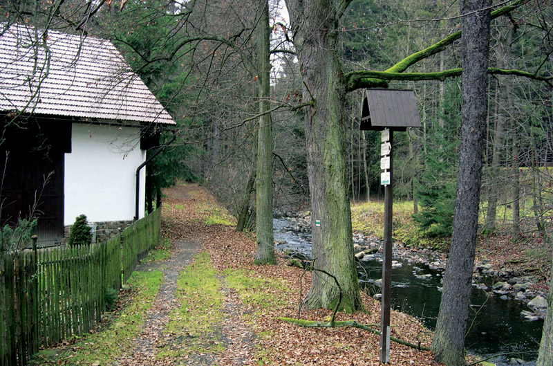Po silnici mimo značení míří trasa ke mlýnu a shluku chalup Na Pilce. Hop přes lávku a oči pátrají po modré. Snad únava již pokročila, snad padl strom pod pilou lesáků, zkrátka až k hájence Přemilov klopýtáme hvozdem bloudě jako Jeníček s Mařenkou. Tady konečně zase potkáváme značení. Trojice malých psíků vytrvale doráží na rotující tretry, leč sil se nedostává, a tak trio otravů mizí až ve sjezdu na silnici do Dolního Brádla. Ke cti zřizovatelů nutno podotknout, že modrá tupě nekopíruje silnici, ale cupitá okrajem lesa, s technickým dokopečkem. Exkurze do Brádla, kdysi sklářského centra, se odkládá, den notně pokročil a spolu s houstnoucí mlhou přichází soumrak. Hodinky leží daleko na nočním stolku, obyvatelé usedlostí sedí u kamen, děsivá představa tmy uprostřed švihu nachází v těle nečekaný zdroj energie. V maratonském tempu šplhá žlutá do Lipky, na jejímž konci je pod pro změnu 800 let starou lípou hrobka. Pastvinou k lesu, svižným sjezdíkem do údolíčka a nekonečnou loukou skrz hospodářské stavení plné hus a slepic do Velké Stříteže. Odbočku na Spálavu si odpustíme a škádleni protivětrem pospícháme do Chloumku. Ani tady nekončí solidní biking, pěšina hravě poskakuje mezi stromy až k potůčku Barovka. S tmou v patách jako šílení uháníme do obce Barovice a dál do Vestce. Hosteska se šklebí, její kunčofti usnuli zpiti hříchem. Slyš mou řeč o hříchu a seznáš, že tohle je on.