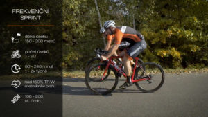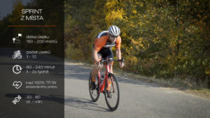 Interval opakujeme pětkrát až dvacetkrát, jeden úsek měří 150–200 metrů a zařadíme ho jednou až dvakrát týdně ve stupňovacím, vrcholném, závodním období cyklistické sezony. Mezi intenzivními úseky odpočíváme při volné regenerační jízdě 4 až 5 minut. Kvůli nízké reakční době tepové frekvence použijte pro změření úseku vždy údaje z wattmetru nebo se řiďte pocitem, který by měl odpovídat sto procentům osobního maxima. Důraz klademe i na správnou techniku při náročném intenzivním zatížení. Je třeba zapojit i svaly trupu a zpevnit zejména břišní svaly. Síla z dolní končetiny a rukou přitažených za řídítka je pak přenesena přímo do výkonu. Pokud absolvujete trénink na horském kole, zvolte pro intervaly silnici či cestu, kde se budete moct plně soustředit na výkon. A snažte se jet v co nejoptimálnější poloze. Trénink zařazujeme jednou až dvakrát týdně ve všech obdobích sezony.