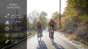 Sprint do kopce se 4–6procentním stoupáním je velmi intenzivní a náročný tréninkový prvek. Z volné aerobní jízdy se při sprintu do prudkého stoupání snažíme výkon vystupňovat, abychom co nejtěžší převod roztočili co nejvíce. Při optimálním přenosu síly jdeme od začátku úseku ze sedla a vším úsilím se snažíme vystupňovat rychlost pohybu a otáček (80 otáček a více) do konce intervalu. Intenzita se pohybuje nad 150 procent anaerobního prahu a frekvence šlapání se v úseku do prudkého kopce pohybuje mezi 80 až 100 otáčkami za minutu (měly by být co nejvyšší). Jezdec je v aerodynamické poloze nebo se drží za páky, zvedá se ze sedla a do cíle sprintuje stále ze sedla. Celková doba intervalu je 15–60 sekund, intenzita se pohybuje nad 150 procenty anaerobního prahu. Interval opakujeme třikrát až desetkrát, úsek trvá 20–60 sekund, intenzita zatížení je 150 procent anaerobního prahu a více. Frekvence šlapání je co nejvyšší a je potřeba zvolit optimální převod.