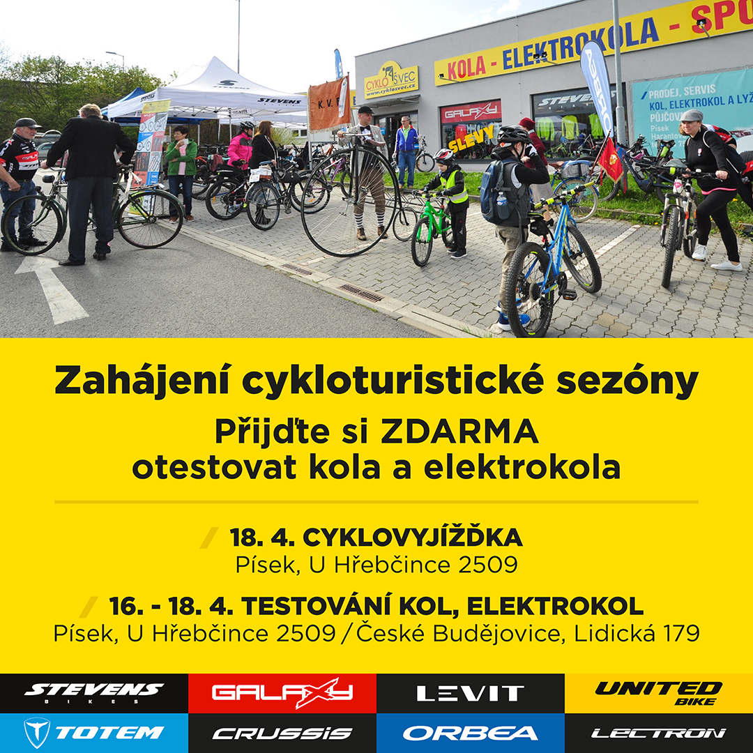 Zveme Vás na testování kol a elektrokol Stevens, Galaxy, Totem, Orbea, Levit, Lectron, Crussis, Teewing aj. 16. – 18.4. v prodejnách CYKLOŠVEC Písek a České Budějovice. V sobotu 18.4. budou tyto prodejny otevřeny do 16 hod.